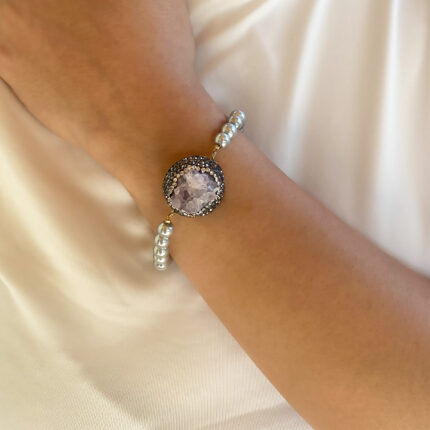 Bραχιόλι Agapis με πέρλες γκρι και αμέθυστο και περιμετρικά στρας, κούμπωμα σε χρυσό από ανοξείδωτο ατσάλι, με προέκταση για να