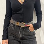 Γυναικεία ζώνη μαύρη με χρυσά τρουκς και οβαλ αγκράφα από pu