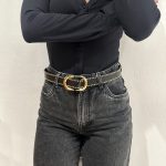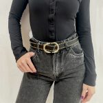 Αρχική σελίδα Αξεσουάρ Ζώνες Γυναικεία ζώνη μαύρη με χρυσά τρουκς και οβαλ αγκράφα από pu