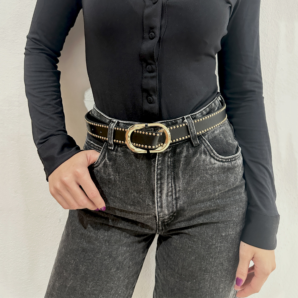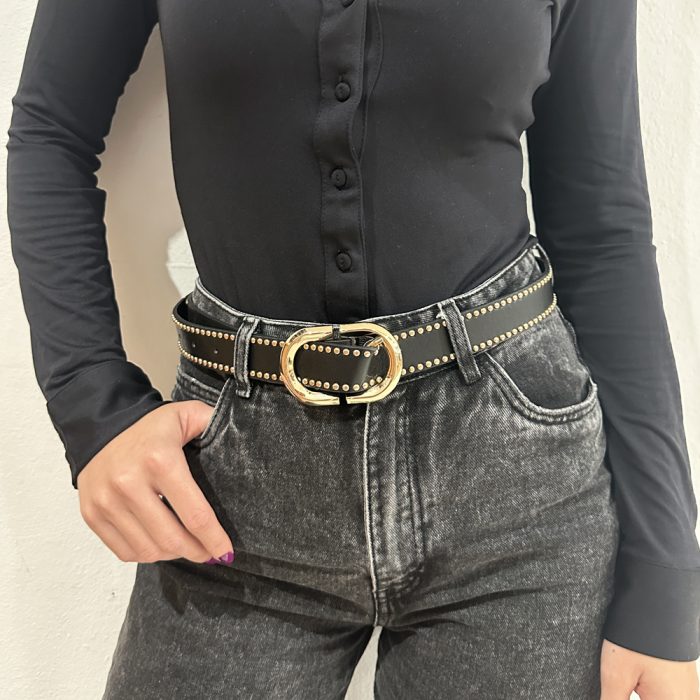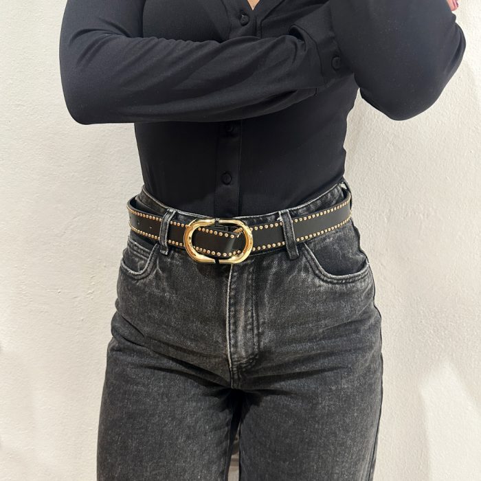 Γυναικεία ζώνη μαύρη με χρυσά τρουκς και οβαλ αγκράφα από pu