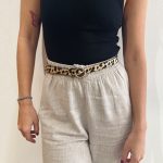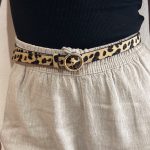 Γυναικεία ζώνη animal print με χρυσή μπρονζέ αγκράφα από pu δέρμα, μπεζ απόχρωση με διαστάσεις 106cm Χ 2,9cm, οικολογικό ξυρισμένο