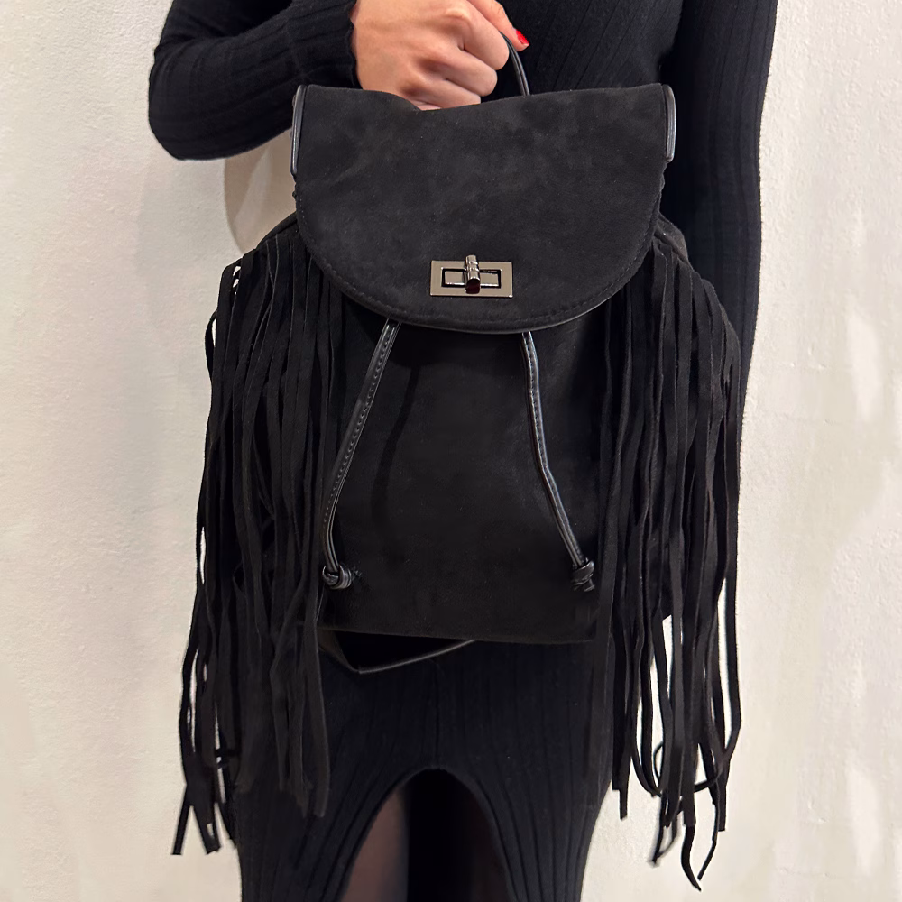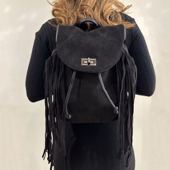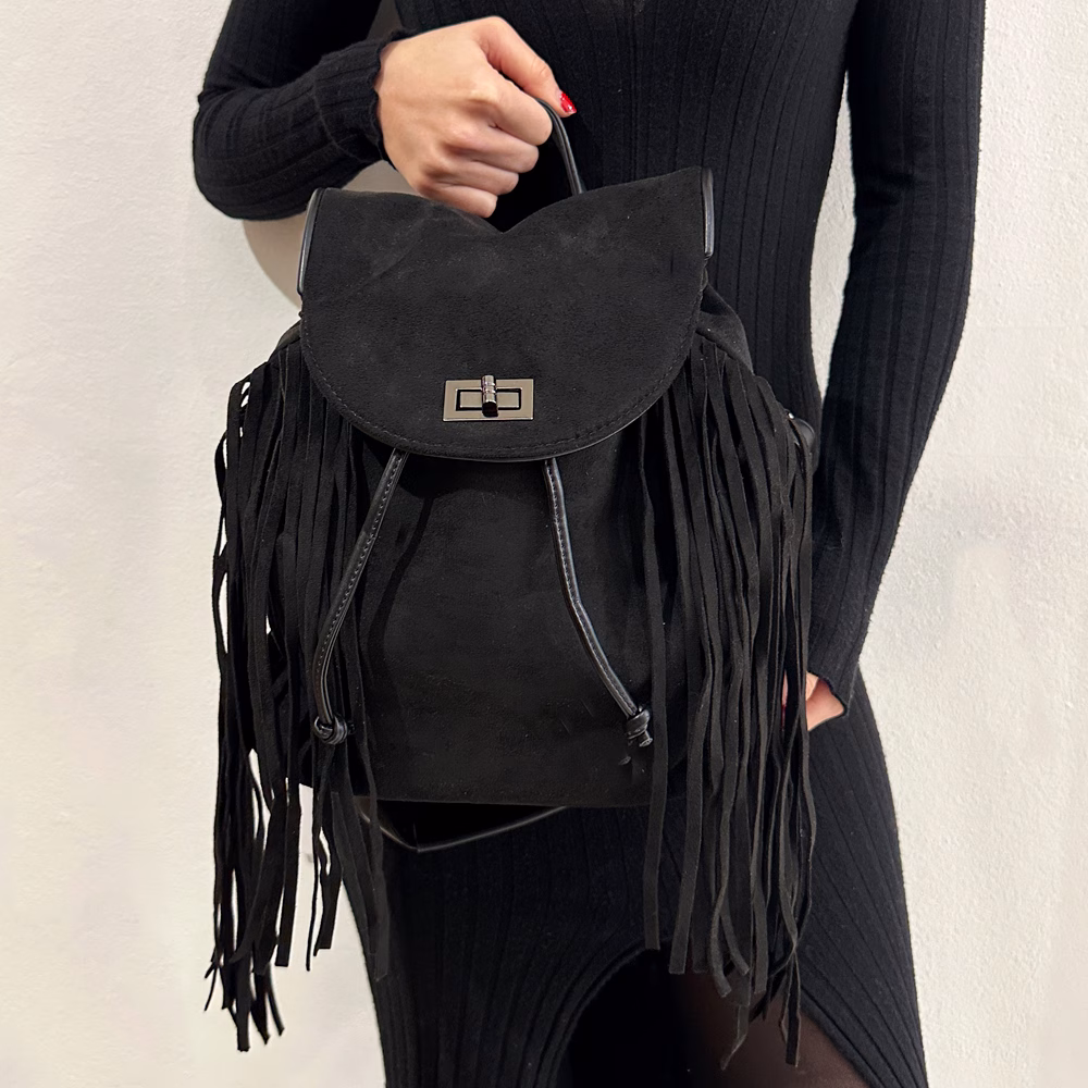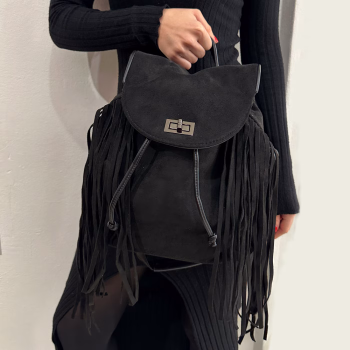 Γυναικεία τσάντα πλάτης σουετ μαύρη με κρόσσια
