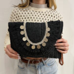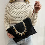 Γυναικεία τσάντα Aci ψάθινη σε μαύρο με χρυσό και κρεμαστά στοιχεία χρυσά. Φάκελος με λουρί για να μπορει να φορεθεί και χιαστί. Το πιο εντυπωσιακό τσαντάκι που θα κρατήσετε ποτε και θα τραβήξει ολα τα βλέμματα. Μια επιλογή εξαιρετικής κομψότητας και design για κάθε σας έξοδο.