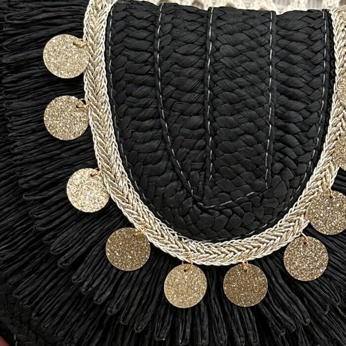 Γυναικεία τσάντα Aci ψάθινη σε μαύρο με χρυσό και κρεμαστά στοιχεία χρυσά. Φάκελος με λουρί για να μπορει να φορεθεί και χιαστί. Το πιο εντυπωσιακό τσαντάκι που θα κρατήσετε ποτε και θα τραβήξει ολα τα βλέμματα. Μια επιλογή εξαιρετικής κομψότητας και design για κάθε σας έξοδο.