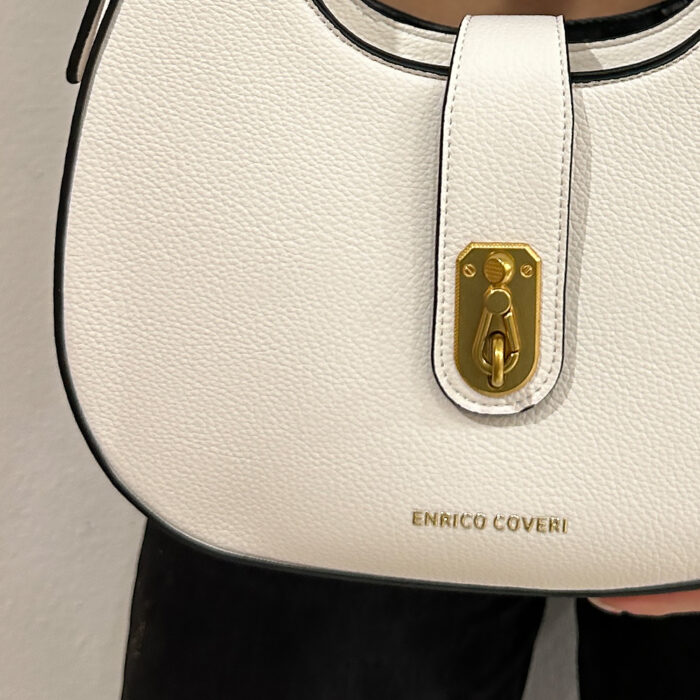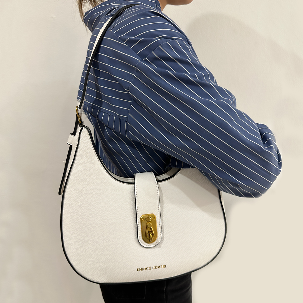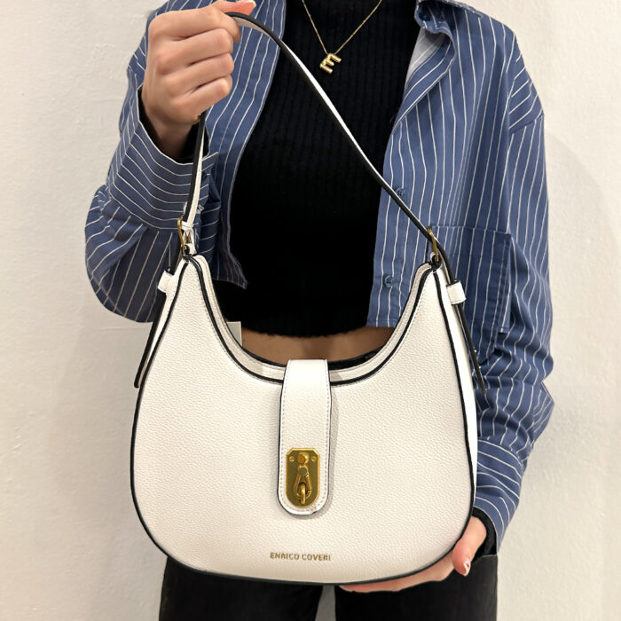 Γυναικεία τσάντα enrico coveri white με αυξομείωση στο λουράκι ώμου, κούμπωμα με φερμουάρ και επιπλέον κούμπωμα με ιδιαίτερο γαντζάκι, με χρυσές λεπτομέρειες. Εσωτερική θήκη με φερμουάρ. Ιταλική τσάντα απο εξαιρετικής ποιότητας pu τεχνόδερμα. Το πιο εντυπωσιακό τσαντάκι που θα κρατήσετε ποτε και θα τραβήξει ολα τα βλέμματα. Μια επιλογή εξαιρετικής κομψότητας και design για κάθε σας έξοδο.