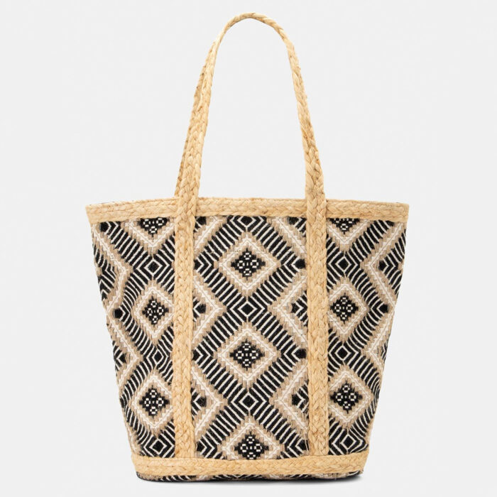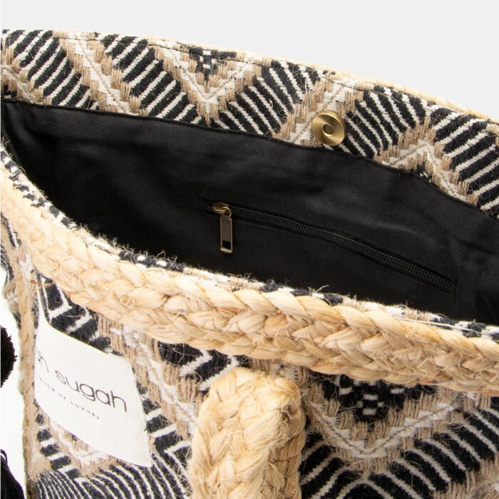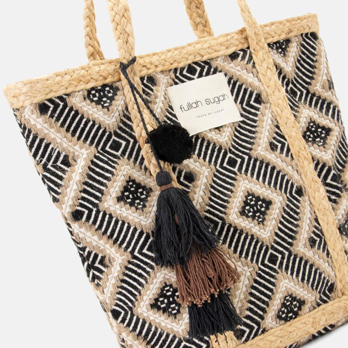 Γυναικεία Τσάντα Fullah Sugah με ασπρόμαυρο boho σχέδιο. Τσάντα με ασπρόμαυρο μπόχο σχέδιο. Εφαρμογή στον ώμο με πλεξίδες χειρολαβές. Ενιαίος αποθηκευτικός χώρος με φόδρα. Κλείνει με μαγνητικό κούμπωμα. ΠΧΒΧΥ : 41X14X35. Σύνθεση : 80%COTTON/20%JUTE