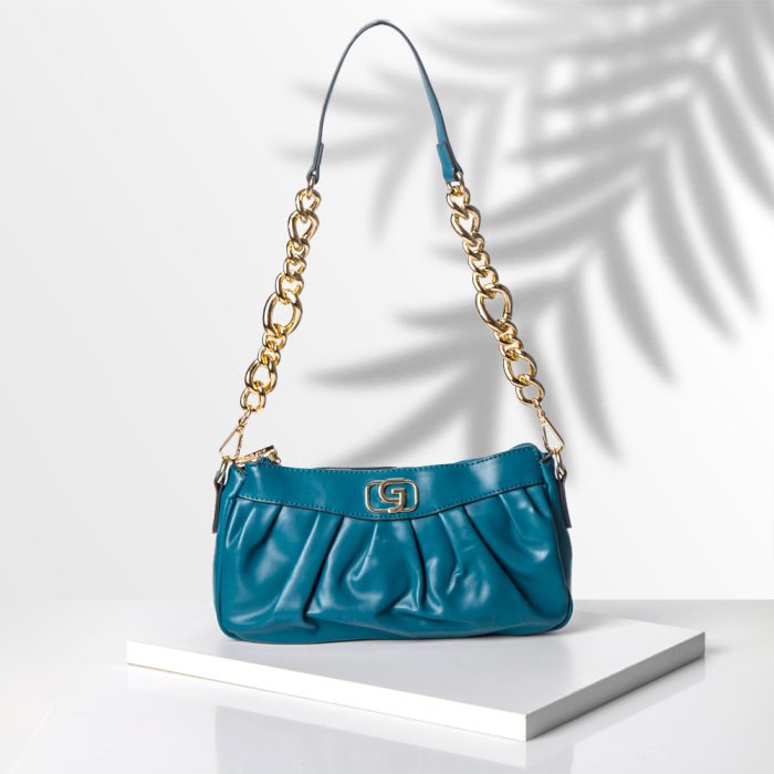 Γυναικεία τσάντα gold&gold σε πετρόλ από pu δέρμα, μπορεί να φορεθεί και ώμου και χιαστί με αλυσίδα χρυσή και λουρί στο ίδιο χρώμα και αυξομείωση στο ύψος που θέλετε, ευρύχωρη με εσωτερική επένδυση και θήκη εσωτερικά με φερμουάρ. Μια επιλογή για όλες τις ώρες της ημέρας. Διάσταση 25Χ15cm