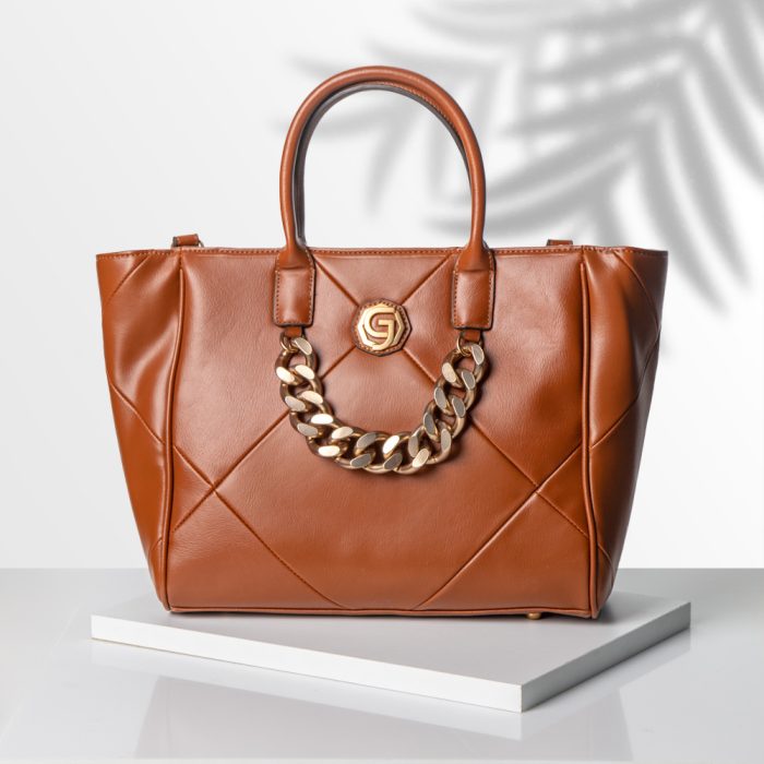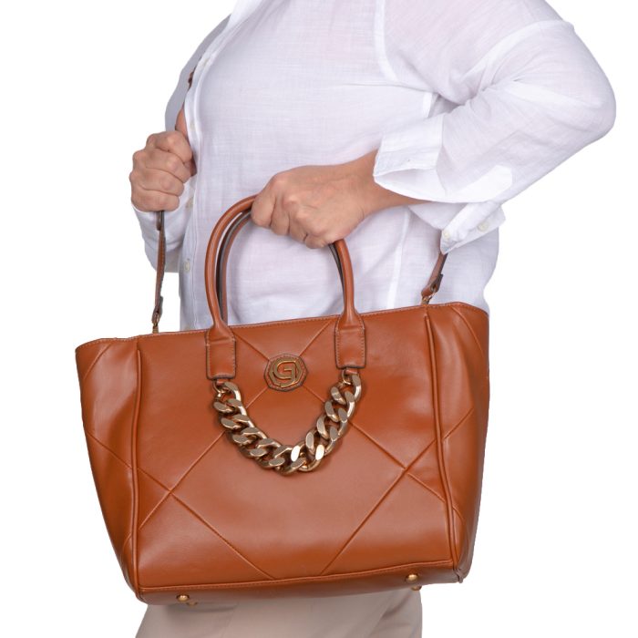 Γυναικεία τσάντα gold&gold σε ταμπά χρώμα καπιτονέ με χρυσές λεπτομέρειες, απο εξαιρετικής ποιότητας pu. Mπορεί να φορεθεί και ώμου και χιαστί με λουρί στο ίδιο χρώμα και αυξομείωση στο ύψος που θέλετε, ευρύχωρη με εσωτερική επένδυση και θήκη εσωτερικά με φερμουάρ. Μια επιλογή εξαιρετικής κομψότητας και ποιότητας που δεν θα αποχωριστείτε ποτέ. Διάσταση 36Χ27cm