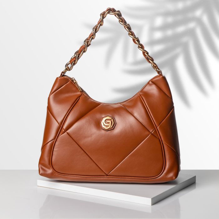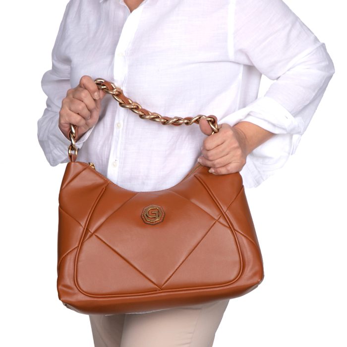 Γυναικεία τσάντα gold&gold σε ταμπά χρώμα καπιτονέ με χρυσές λεπτομέρειες, απο εξαιρετικής ποιότητας pu. Mπορεί να φορεθεί και ώμου με την αλυσίδα και χιαστί με λουρί στο ίδιο χρώμα και αυξομείωση στο ύψος που θέλετε, ευρύχωρη με εσωτερική επένδυση και θήκη εσωτερικά με φερμουάρ. Μια επιλογή εξαιρετικής κομψότητας και ποιότητας που δεν θα αποχωριστείτε ποτέ. Διάσταση 36Χ28cm