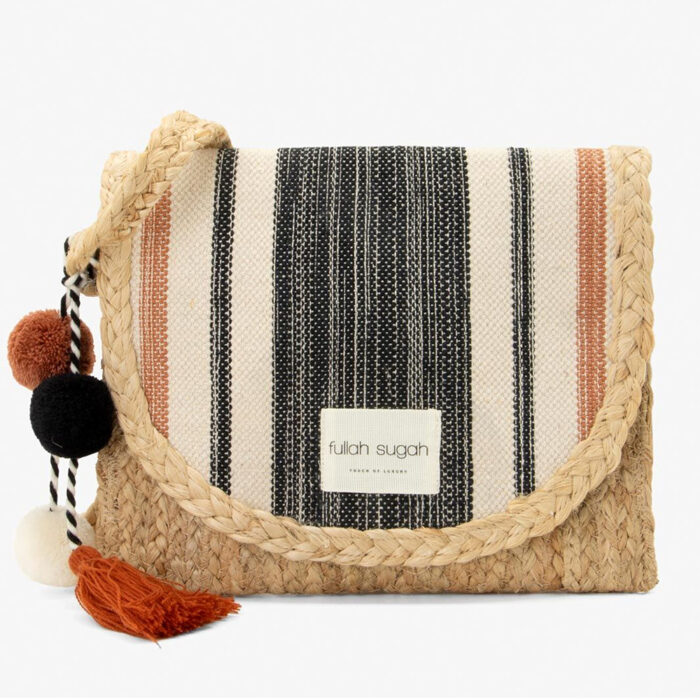 Γυναικεία Τσάντα φάκελος Fullah Sugah με ριγέ καπάκι. Τσάντα φάκελος γιούτα με ριγέ σχέδιο στο καπάκι. Ιμάντας πλεξίδα για χιαστί εφαρμογή. Ενιαίος εσωτερικός χώρος χωρίς φόδρα. Καπάκι με μαγνητικό κούμπωμα. ΠΧΥ : 28X23. Σύνθεση : 95% JUTE/5%COTTON. Το πιο εντυπωσιακό τσαντάκι που θα κρατήσετε ποτε και θα τραβήξει ολα τα βλέμματα. Μια επιλογή εξαιρετικής κομψότητας και design.