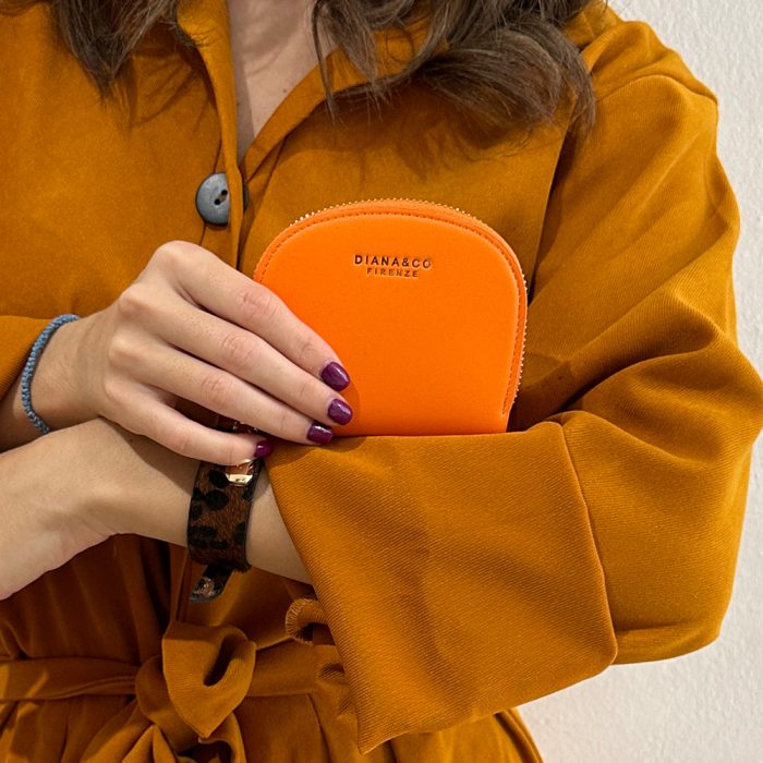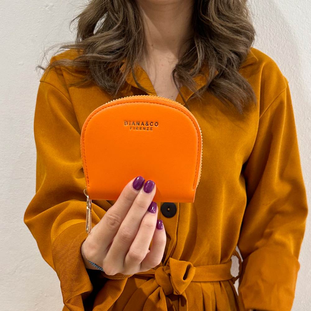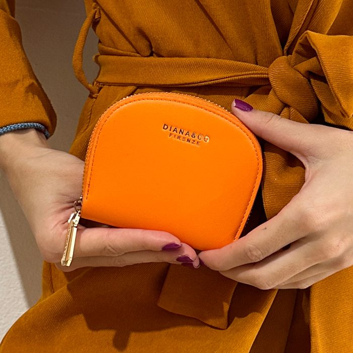 Πορτοφόλι πορτοκαλί με χρυσές λεπτομέρειες. Διάσταση 11cm πλάτος X 9,5cm ύψος. Κατασκευασμένο από εξαιρετικής ποιότητας pu τεχνόδερμα.
