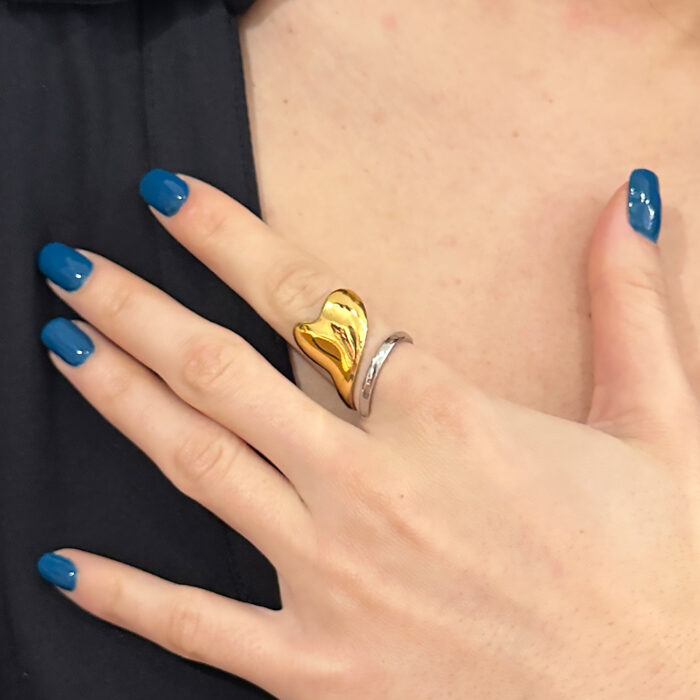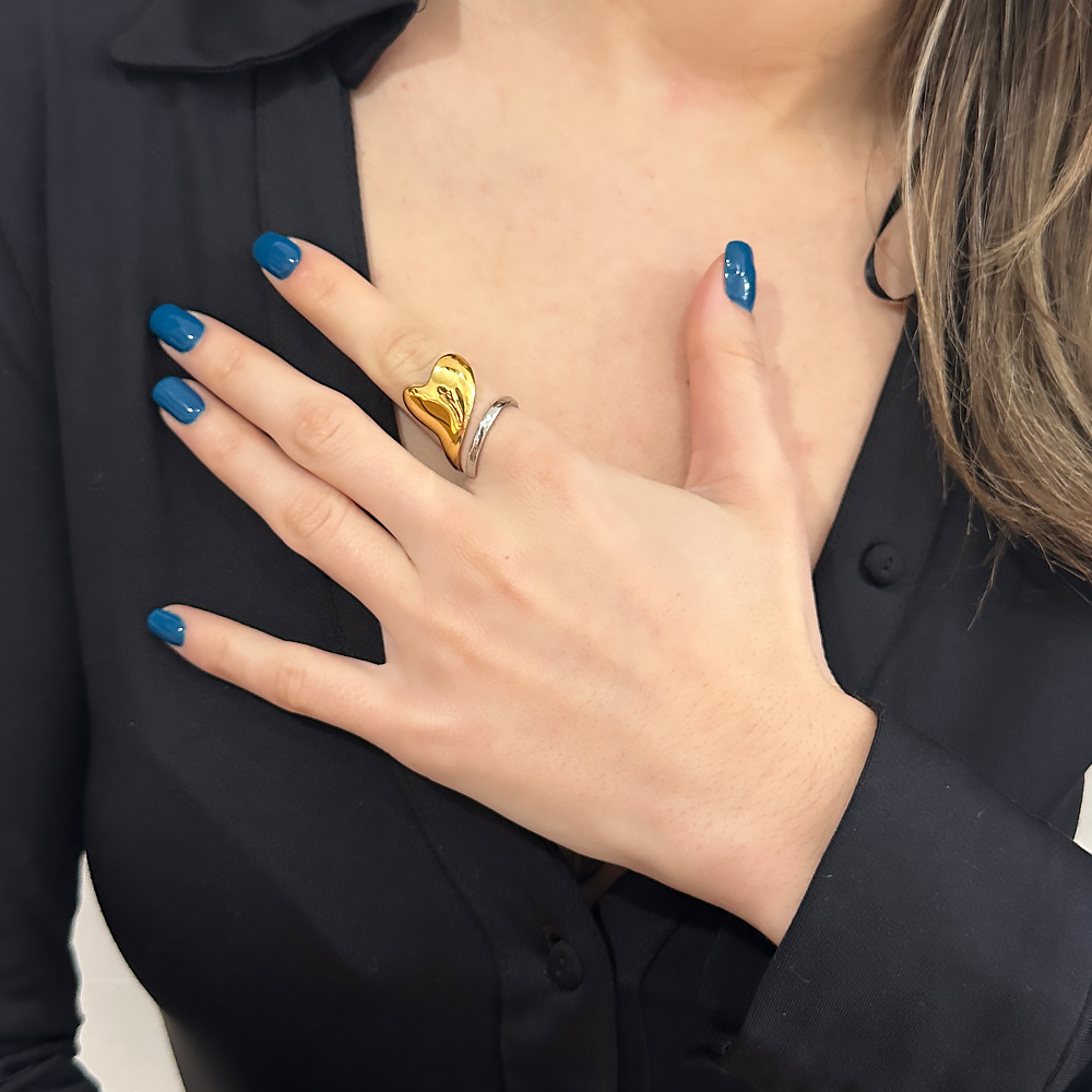 Δαχτυλίδι Adrianna χρυσό ασημί καρδιά απο ανοξείδωτο ατσάλι, με άνοιγμα για να εφαρμόζεται σε όλα τα δάχτυλα. Όλα τα υλικά είναι υποαλλεργικά και δεν μαυρίζουν. Κάθε κόσμημα από το κατάστημά μας κατασκευάζεται και επιλέγεται από εμάς για εσάς με αγάπη. Γι’ αυτό το κάθε κόσμημα που επιλέγετε, σας έρχεται σε κουτί συσκευασίας δώρου από το tesera.gr!