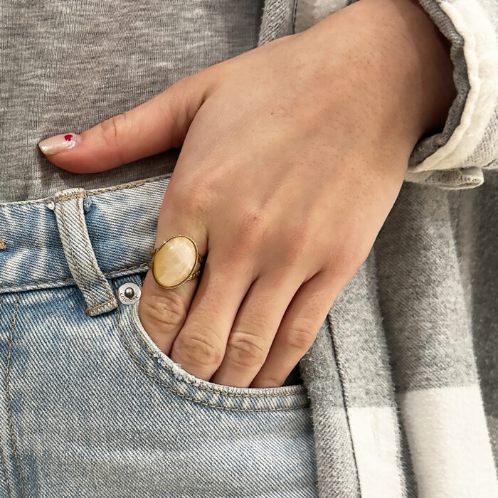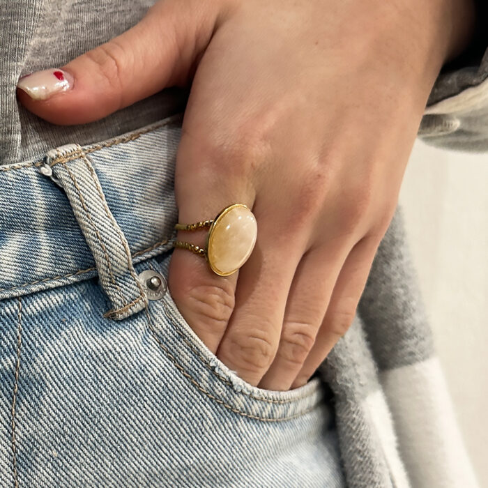 Δαχτυλίδι Adylin χρυσό με μπεζ πέτρα απο ανοξείδωτο ατσάλι, με άνοιγμα για να εφαρμόζεται σε όλα τα δάχτυλα. Όλα τα υλικά είναι υποαλλεργικά και δεν μαυρίζουν. Κάθε κόσμημα από το κατάστημά μας κατασκευάζεται και επιλέγεται από εμάς για εσάς με αγάπη. Γι’ αυτό το κάθε κόσμημα που επιλέγετε, σας έρχεται σε κουτί συσκευασίας δώρου από το tesera.gr!