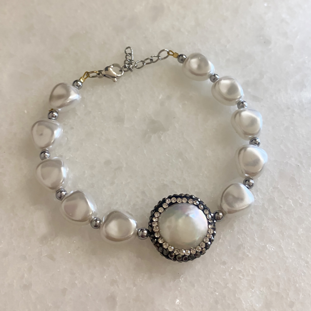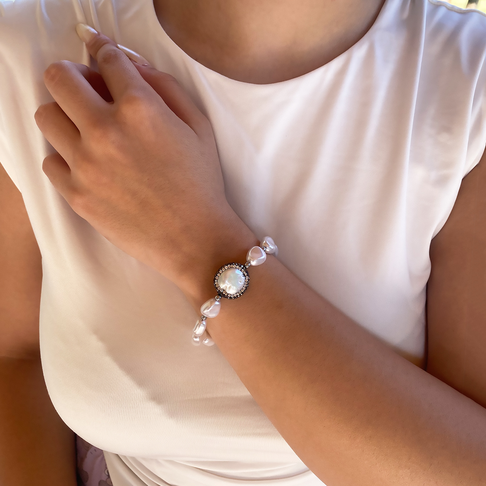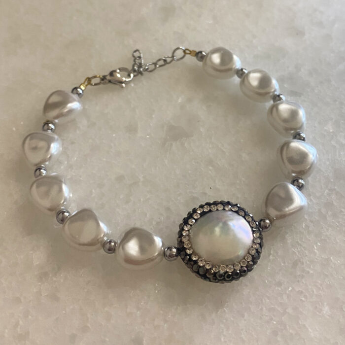 Bραχιόλι Alicia με πέρλες άσπρες και μαργαριτάρι με περιμετρικά στρας, κούμπωμα σε χρυσό από ανοξείδωτο ατσάλι, με προέκταση για να εφαρμόζει στο ύψος που θέλετε. Συνδυάζεται με όλα τα κοσμήματα σας. Όλα τα υλικά είναι υποαλλεργικά και δεν μαυρίζουν. Κάθε κόσμημα από το κατάστημά μας κατασκευάζεται και επιλέγεται από εμάς για εσάς με αγάπη. Γι’ αυτό το κάθε κόσμημα που επιλέγετε, σας έρχεται σε κουτί συσκευασίας δώρου από το tesera.gr!