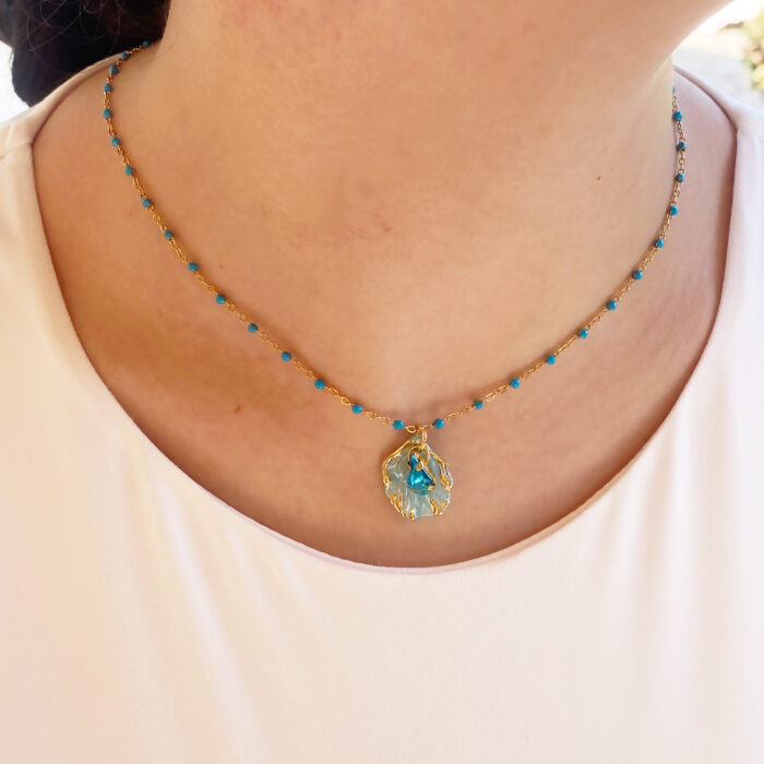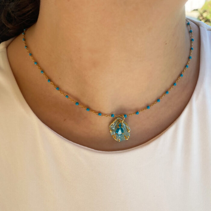 Κολιέ Ariel μπλε, με κρυσταλλάκι μπλε και κοχυλάκι σιελ με χρυσές λεπτομέρειες, αλυσίδα με σμάλτο μπλε απο ανοξείδωτο ατσάλι. Η πιο μοντέρνα σειρά χειροποίητων κοσμημάτων που θα απογειώσει κάθε σας outfit. Ξεχώρισε σε κάθε σου εμφάνιση με την νέα συλλογή κοσμημάτων απο teseragr. Κάθε κόσμημα από το κατάστημά μας κατασκευάζεται και επιλέγεται από εμάς για εσάς με αγάπη. Γι’ αυτό το κάθε κόσμημα που επιλέγετε, σας έρχεται σε κουτί συσκευασίας δώρου από το tesera.gr!