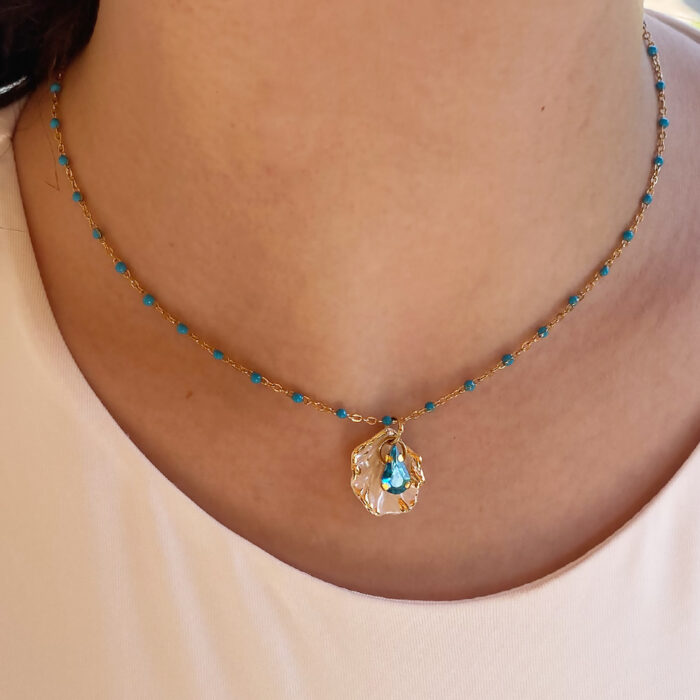 Κολιέ Ariel μπλε, με κρυσταλλάκι μπλε και κοχυλάκι άσπρο με χρυσές λεπτομέρειες, αλυσίδα με σμάλτο μπλε απο ανοξείδωτο ατσάλι. Η πιο μοντέρνα σειρά χειροποίητων κοσμημάτων που θα απογειώσει κάθε σας outfit. Ξεχώρισε σε κάθε σου εμφάνιση με την νέα συλλογή κοσμημάτων απο teseragr. Κάθε κόσμημα από το κατάστημά μας κατασκευάζεται και επιλέγεται από εμάς για εσάς με αγάπη. Γι’ αυτό το κάθε κόσμημα που επιλέγετε, σας έρχεται σε κουτί συσκευασίας δώρου από το tesera.gr!