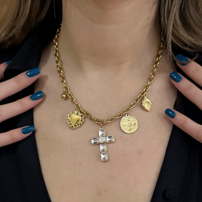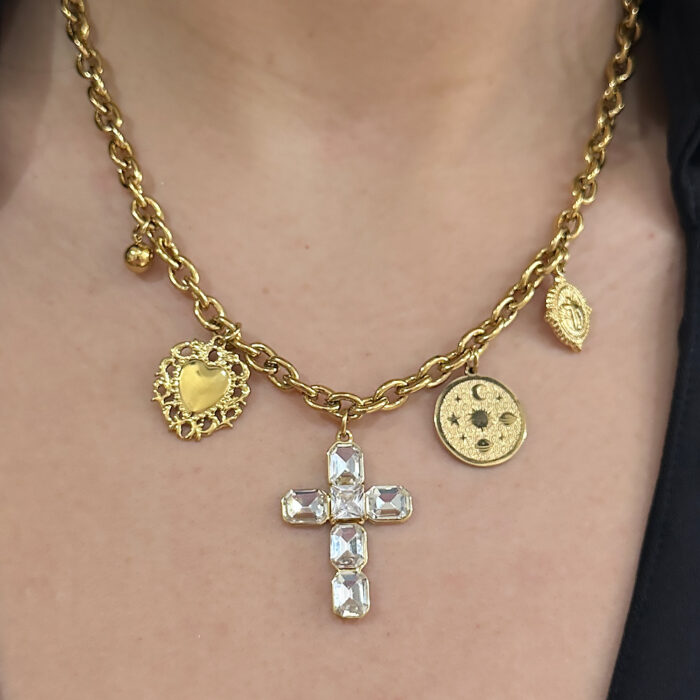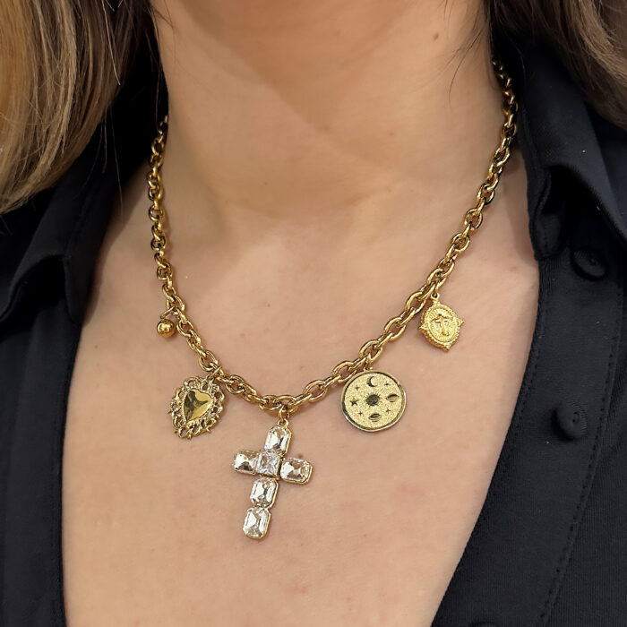 Κολιέ Briana σε χρυσό με σταυρό ζιργκον και κρεμαστά charms από ανοξείδωτο ατσάλι. Με προέκταση για να εφαρμόζει στο ύψος που θέλετε. Η πιο μοντέρνα σειρά κοσμημάτων που θα απογειώσει κάθε σας outfit. Ξεχώρισε σε κάθε σου εμφάνιση με την νέα συλλογή κοσμημάτων απο teseragr. Κάθε κόσμημα από το κατάστημά μας κατασκευάζεται και επιλέγεται από εμάς για εσάς με αγάπη. Γι’ αυτό το κάθε κόσμημα που επιλέγετε, σας έρχεται σε κουτί συσκευασίας δώρου από το tesera.gr!