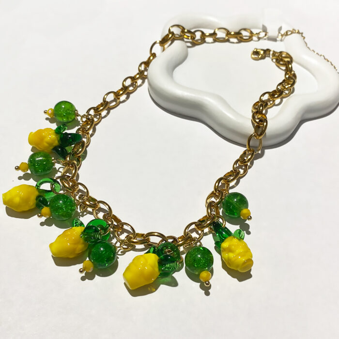 Κολιέ cute fruits κίτρινο πράσινο με χρυσή αλυσίδα απο ανοξείδωτο ατσάλι και κρεμαστά γυάλινα φρουτάκια και ημιπολύτιμους λίθους. Με επέκταση στο κούμπωμα για να εφαρμόζεται στο ύψος που θέλετε. Η πιο μοντέρνα σειρά κοσμημάτων που θα απογειώσει κάθε σας outfit. Ξεχώρισε σε κάθε σου εμφάνιση με την νέα συλλογή κοσμημάτων απο teseragr. Κάθε κόσμημα από το κατάστημά μας κατασκευάζεται και επιλέγεται από εμάς για εσάς με αγάπη. Γι’ αυτό το κάθε κόσμημα που επιλέγετε, σας έρχεται σε κουτί συσκευασίας δώρου από το tesera.gr!
