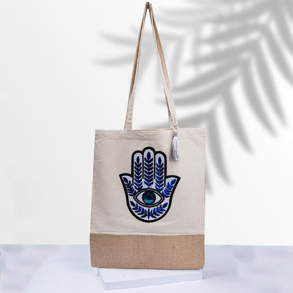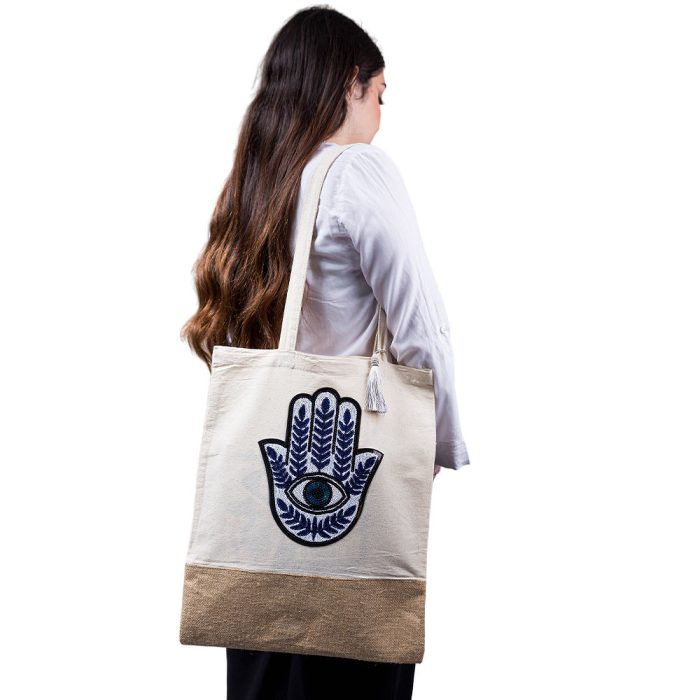 Γυναικεία χειροποίητη τσάντα άσπρη hamsa hand υφασμάτινη με παγέτες άσπρες μπλε και κρεμαστή ασημί φούντα στο χερούλι. Χρώμα άσπρο με μπέζ άμμου. Κατασκευασμένη από εξαιρετικής ποιότητας βαμβακερό ύφασμα και βάση από γιούτα λινάτσα. Η γιούτα είναι φυσικό υλικό και εχει εξαιρετική αντοχή στον ήλιο και τις καιρικές συνθήκες. Μεγάλης χωρητικότητας τσάντα, για όλες τις ώρες της ημέρας και για όλες τις καλοκαιρινές σας αποδράσεις.