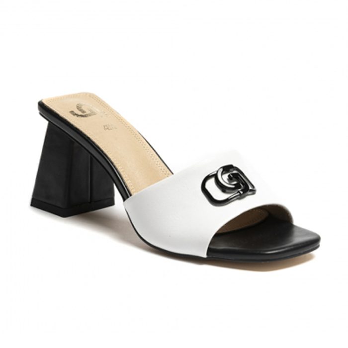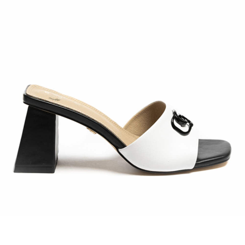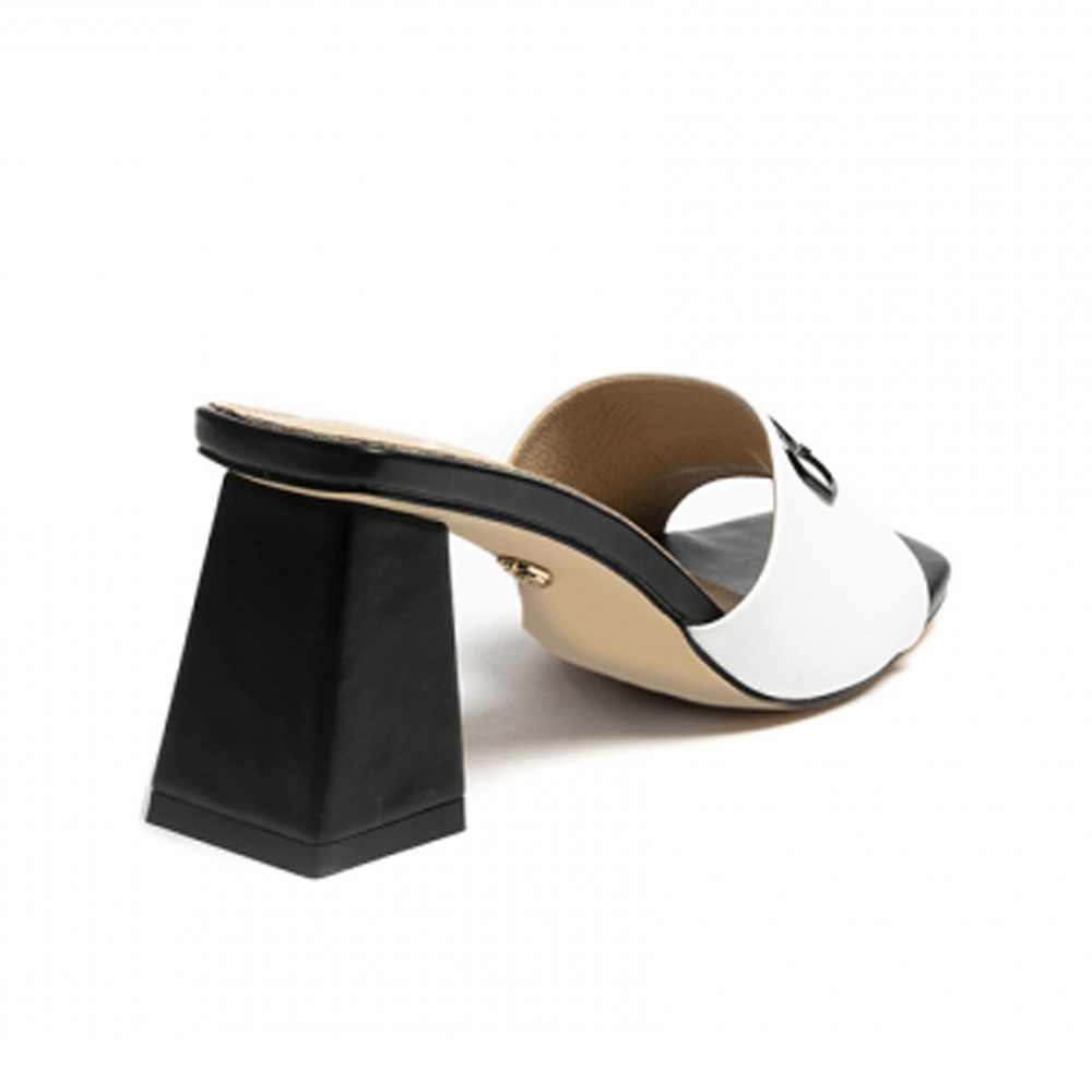 Γυναικεία παπούτσια mules ασπρόμαυρα τετράγωνο τακούνι με μαύρο λογότυπο συνδυασμός δέρματος και pu δέρμα, μαλακό πάτημα ιδανικό να σας καλύψει σε κάθε σας εμφάνιση πρωί βράδυ