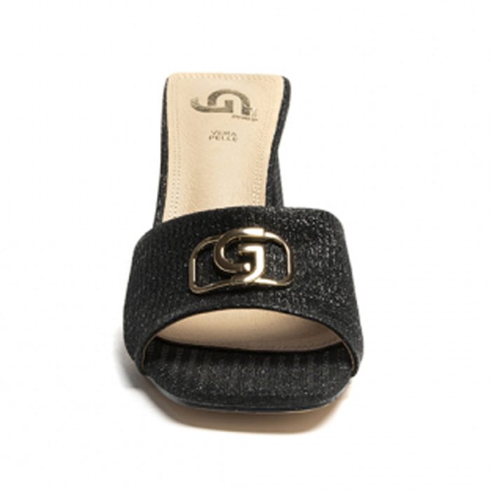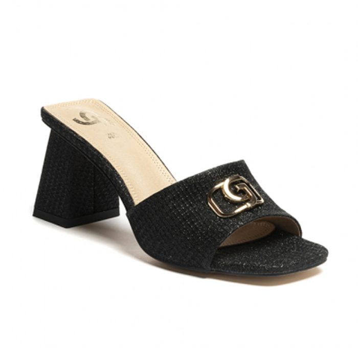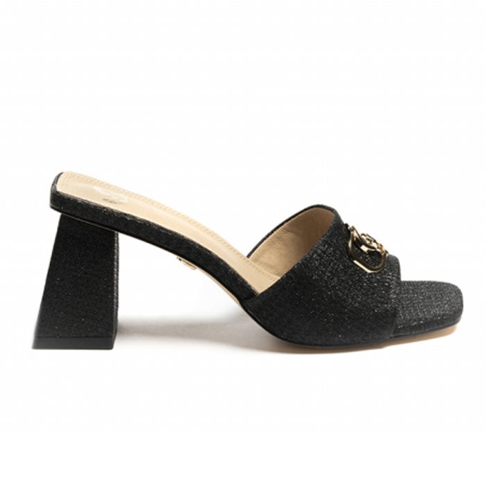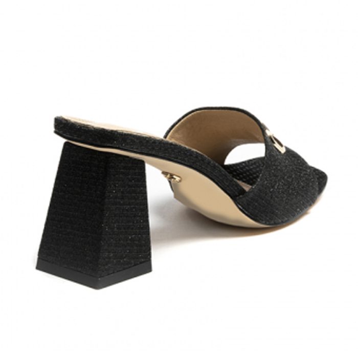 Γυναικεία παπούτσια mules σε πλεκτό μαύρο ιριδίζων τετράγωνο τακούνι με χρυσό λογότυπο συνδυασμός δέρματος και pu δέρμα, μαλακό πάτημα ιδανικό να σας καλύψει σε κάθε σας εμφάνιση πρωί βράδυ