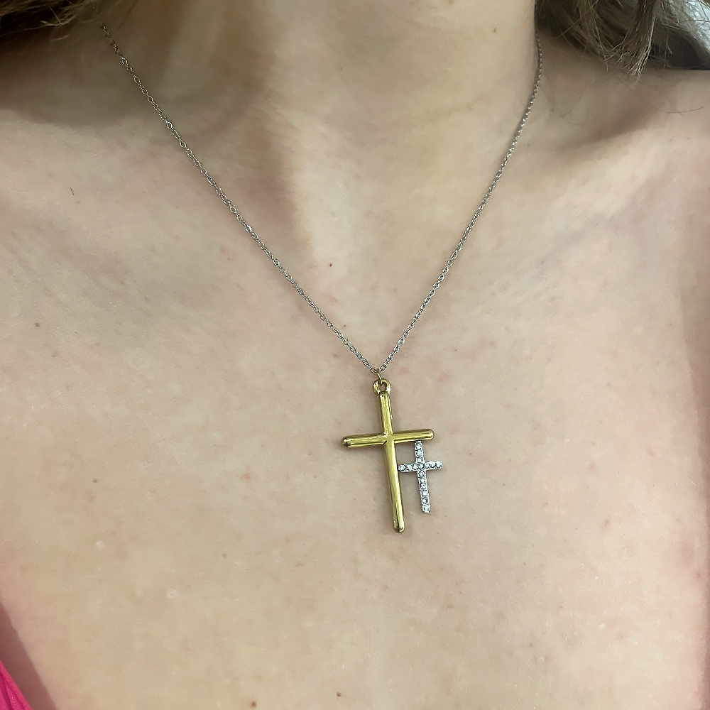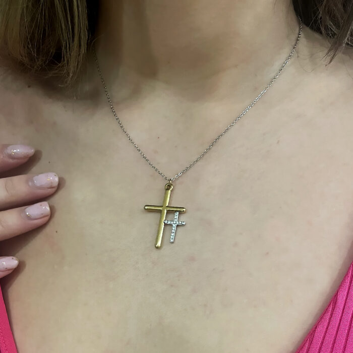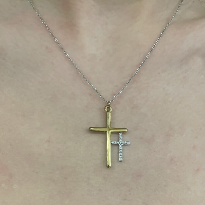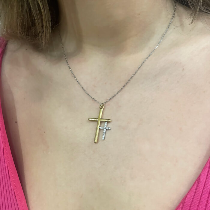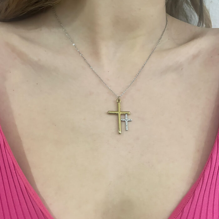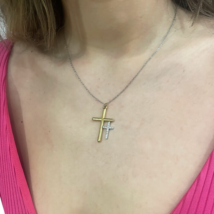 Kολιέ σταυρός διπλός χρυσό ασημί από ανοξείδωτο ατσάλι