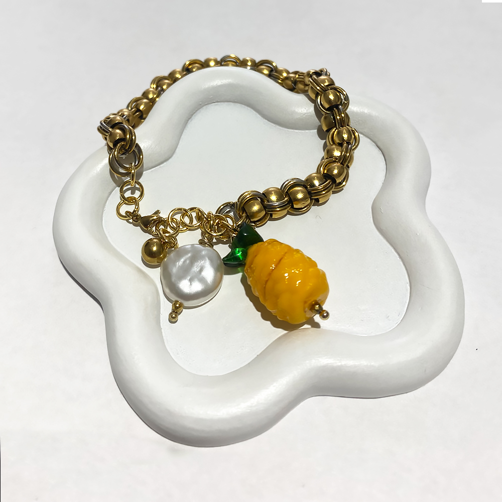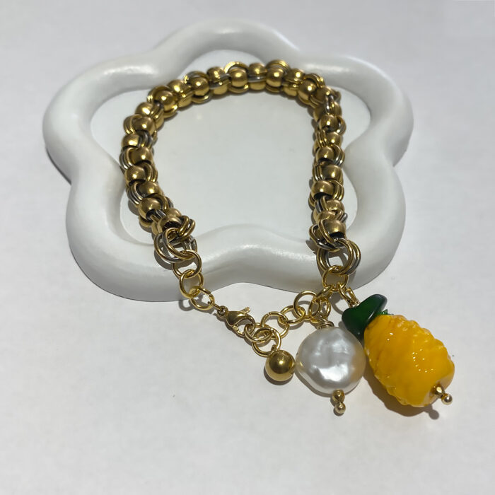 Pineapple βραχιόλι με ιδιαίτερη αλυσίδα χρυσή με ασημί λεπτομέρειες και κρεμαστό ανανά γυάλινο από ανοξείδωτο ατσάλι. Συνδυάζεται με όλα τα κοσμήματα σας. Όλα τα υλικά είναι υποαλλεργικά και δεν μαυρίζουν. Κάθε κόσμημα από το κατάστημά μας κατασκευάζεται και επιλέγεται από εμάς για εσάς με αγάπη. Γι’ αυτό το κάθε κόσμημα που επιλέγετε, σας έρχεται σε κουτί συσκευασίας δώρου από το tesera.gr!