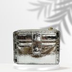 Πορτοφόλι cart pw metallic silver light με χρυσες λεπτομέρειες. Διάσταση 12cm πλάτος X 9cm ύψος και 1cm πλάτος. Μεταλλιζέ Όψη με αλυσίδα για να φοριέται χιαστί. Θήκη για κέρματα και ξεχωριστά θήκες για κάρτες. Κατασκευασμένο από εξαιρετικής ποιότητας pu δέρμα. Κλείνει με φερμουάρ και κουμπί και σας έρχεται συσκευασμένο σε σκληρό κουτί.