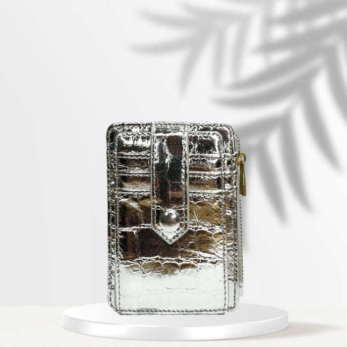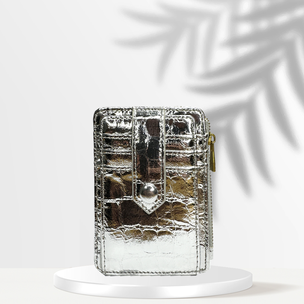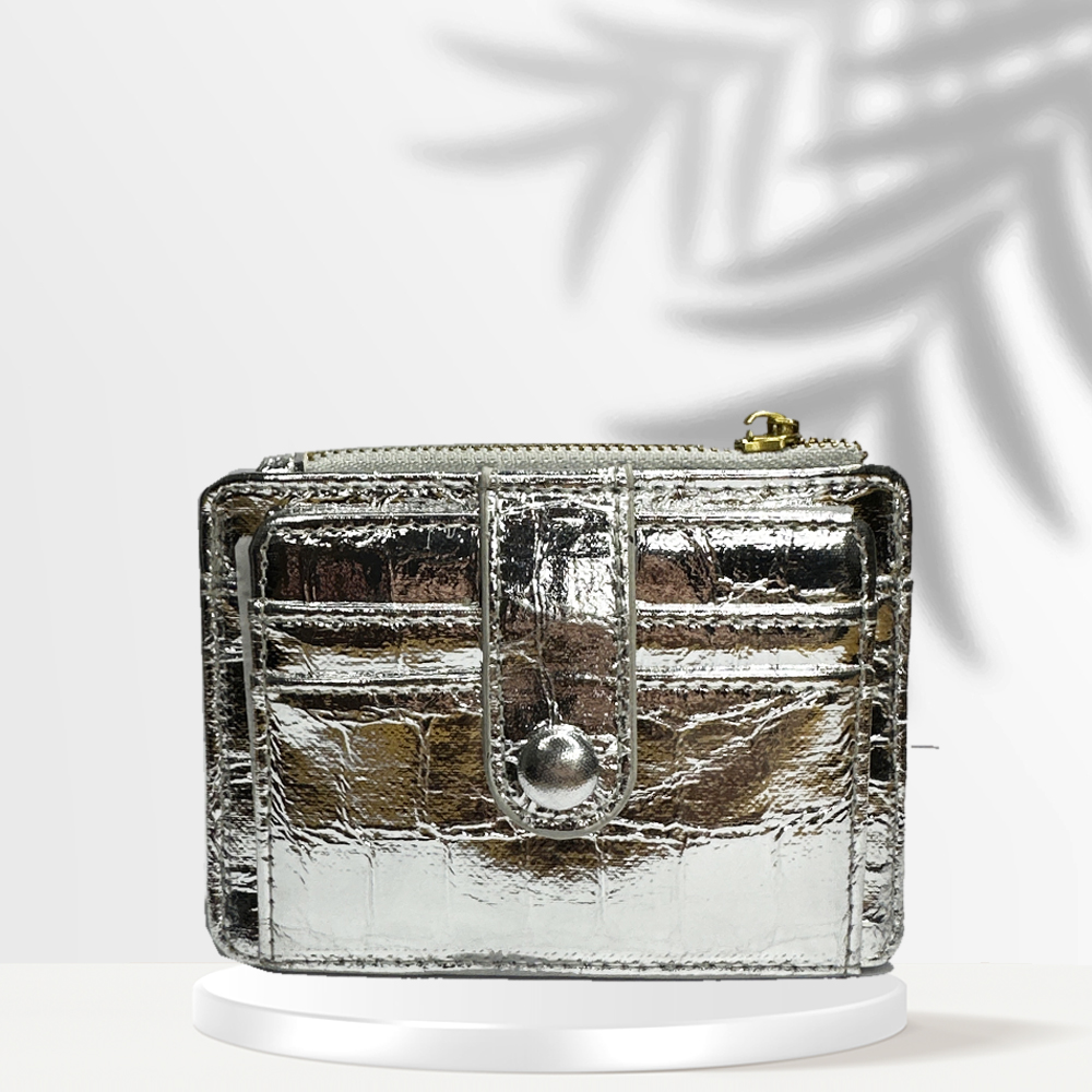 Πορτοφόλι cart pw metallic silver light με χρυσες λεπτομέρειες. Διάσταση 12cm πλάτος X 9cm ύψος και 1cm πλάτος. Μεταλλιζέ Όψη με αλυσίδα για να φοριέται χιαστί. Θήκη για κέρματα και ξεχωριστά θήκες για κάρτες. Κατασκευασμένο από εξαιρετικής ποιότητας pu δέρμα. Κλείνει με φερμουάρ και κουμπί και σας έρχεται συσκευασμένο σε σκληρό κουτί.