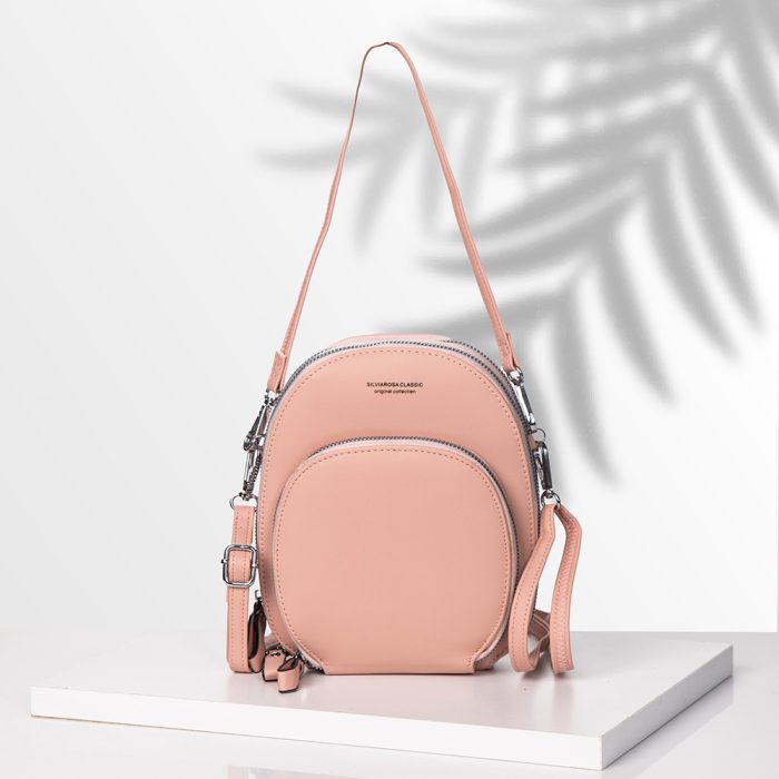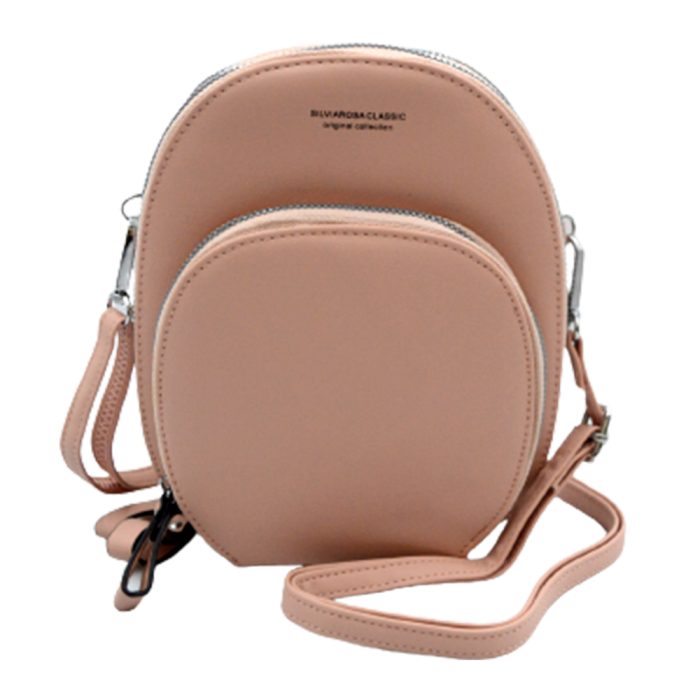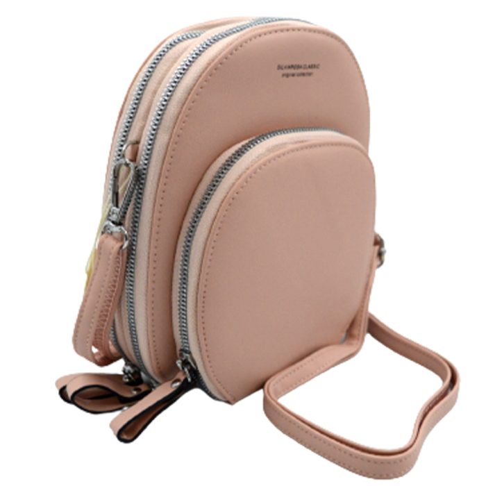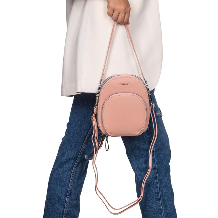 Τσάντα πλάτης και ώμου οβάλ ροζ 3 θέσεων με ασημί φερμουάρ από PU δέρμα