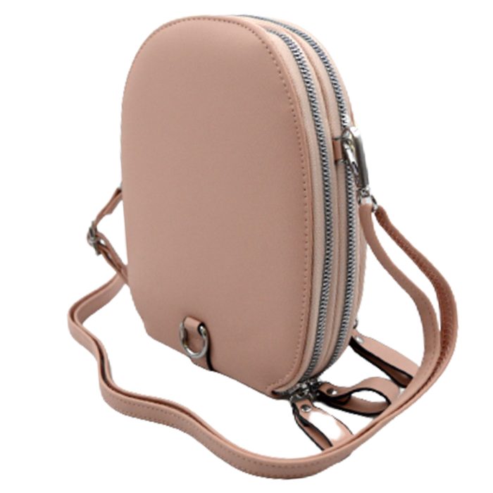 Τσάντα πλάτης και ώμου οβάλ ροζ 3 θέσεων με ασημί φερμουάρ από PU δέρμα, με λουράκια με επέκταση για να την εφαρμόζεται στο ύψος που θέλετε, δυνατότητα να κρατηθεί και σαν ώμου και χιαστί, ευρύχωρη 3 θέσεις με φερμουάρ εσωτερική επένδυση από ύφασμα, διάσταση 19×23, άνετη και ιδανική για όλες τις ώρες.